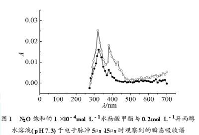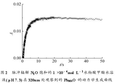 在320nm和380nm觀察到兩個寬而強的吸收峰。320nm、380nm吸收峰被歸屬為水楊酸甲酯酚氧自由基(PhMSO·),這是羥基自由基進攻水楊酸甲酯分子結(jié)構(gòu)中酚羥基,抽氫所形成。320nm、380nm瞬態(tài)粒子的產(chǎn)生主要來自以下過程:MS+·OH PhMSO·+H2O脈沖輻解N2O飽和的1×10-4mol·L-1水楊酸甲酯水溶液(pH7.3),所產(chǎn)生的PhMSO·在320nm、380nm處觀察到的動力學生成曲線如圖2所示。