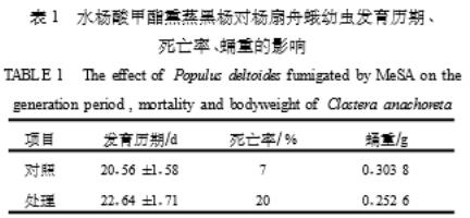 水楊酸甲酯熏蒸黑楊對(duì)楊扇舟蛾的影響水楊酸甲酯熏蒸黑楊對(duì)楊扇舟蛾發(fā)育歷期、死亡率和蛹重的影響,見下表1: